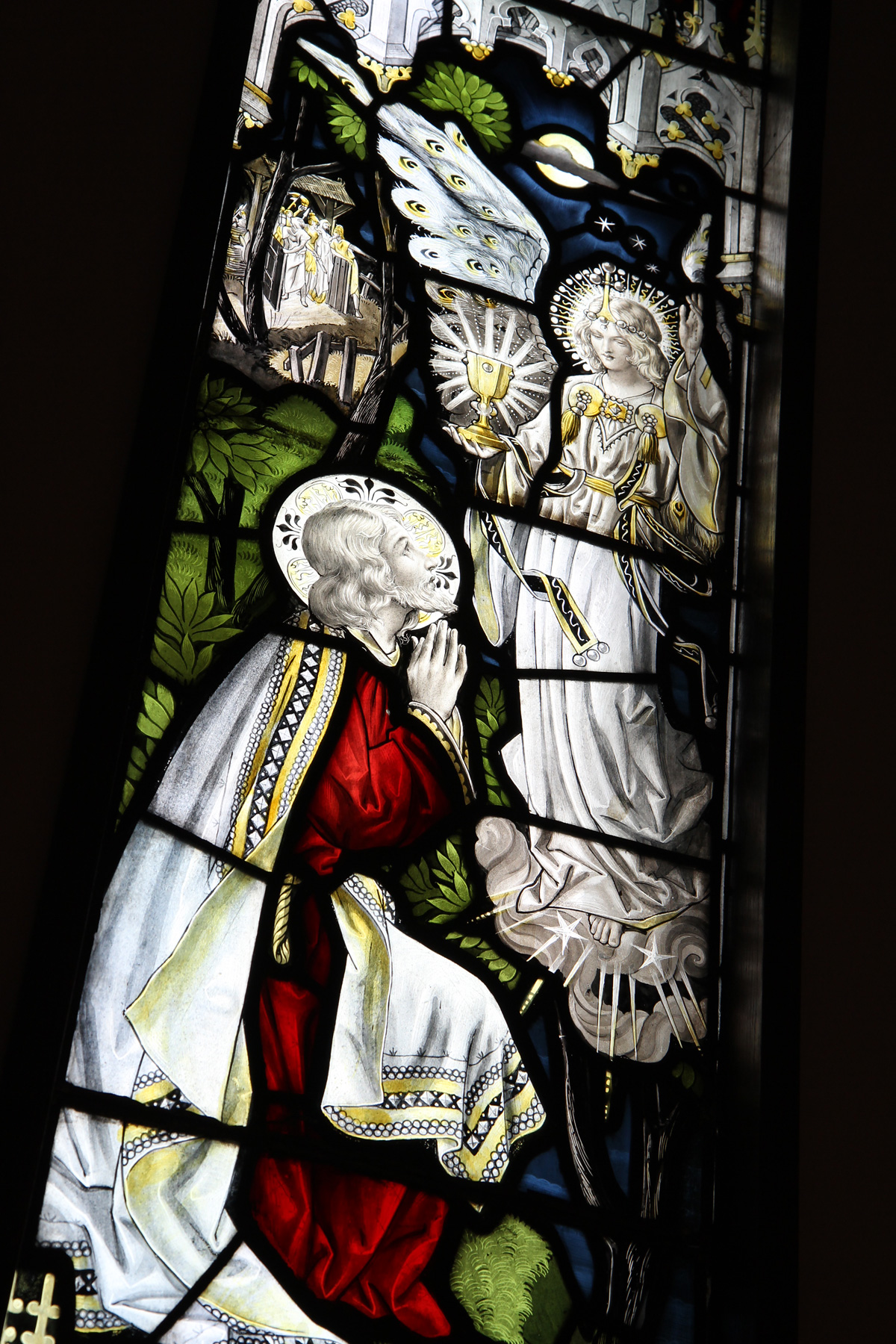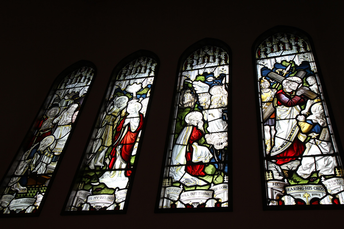 礼拝堂の階段室に飾られた4面のステンドグラス。いずれもイエス・キリストの生涯の出来事が描かれています。
