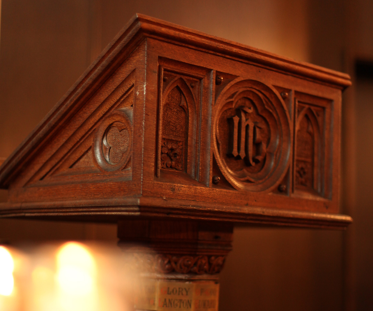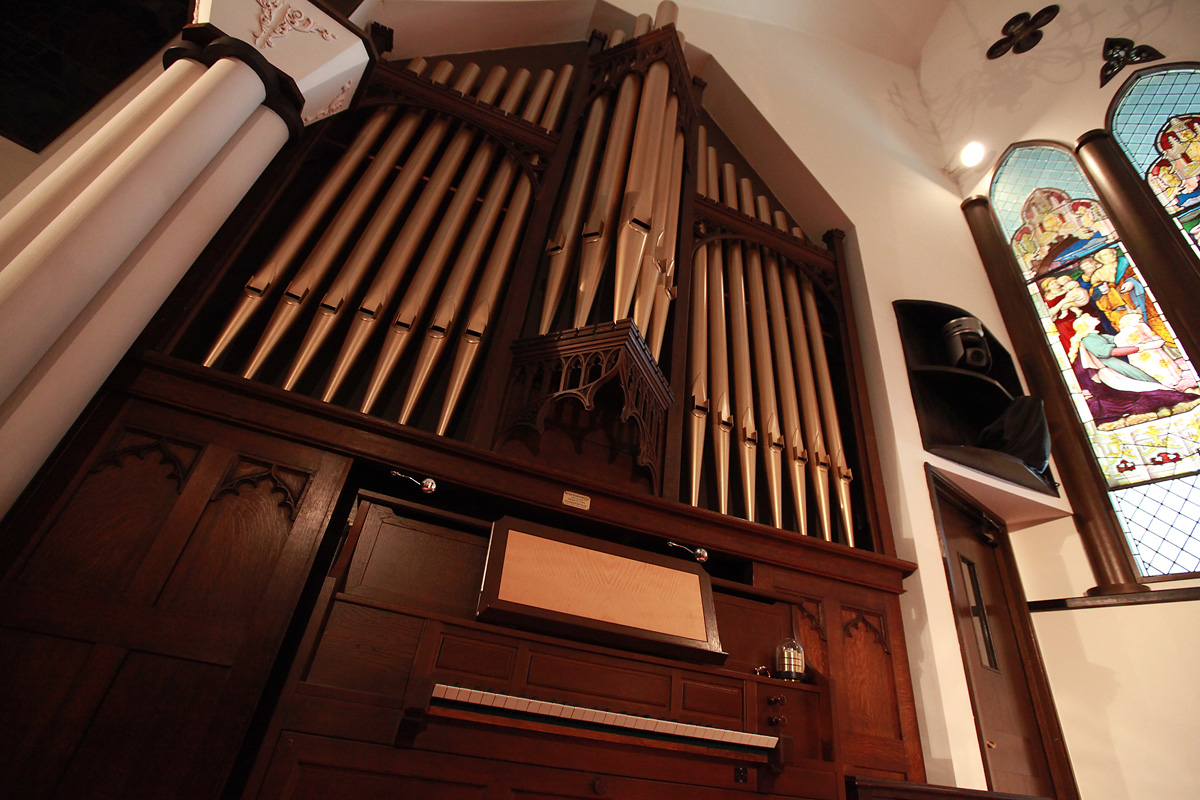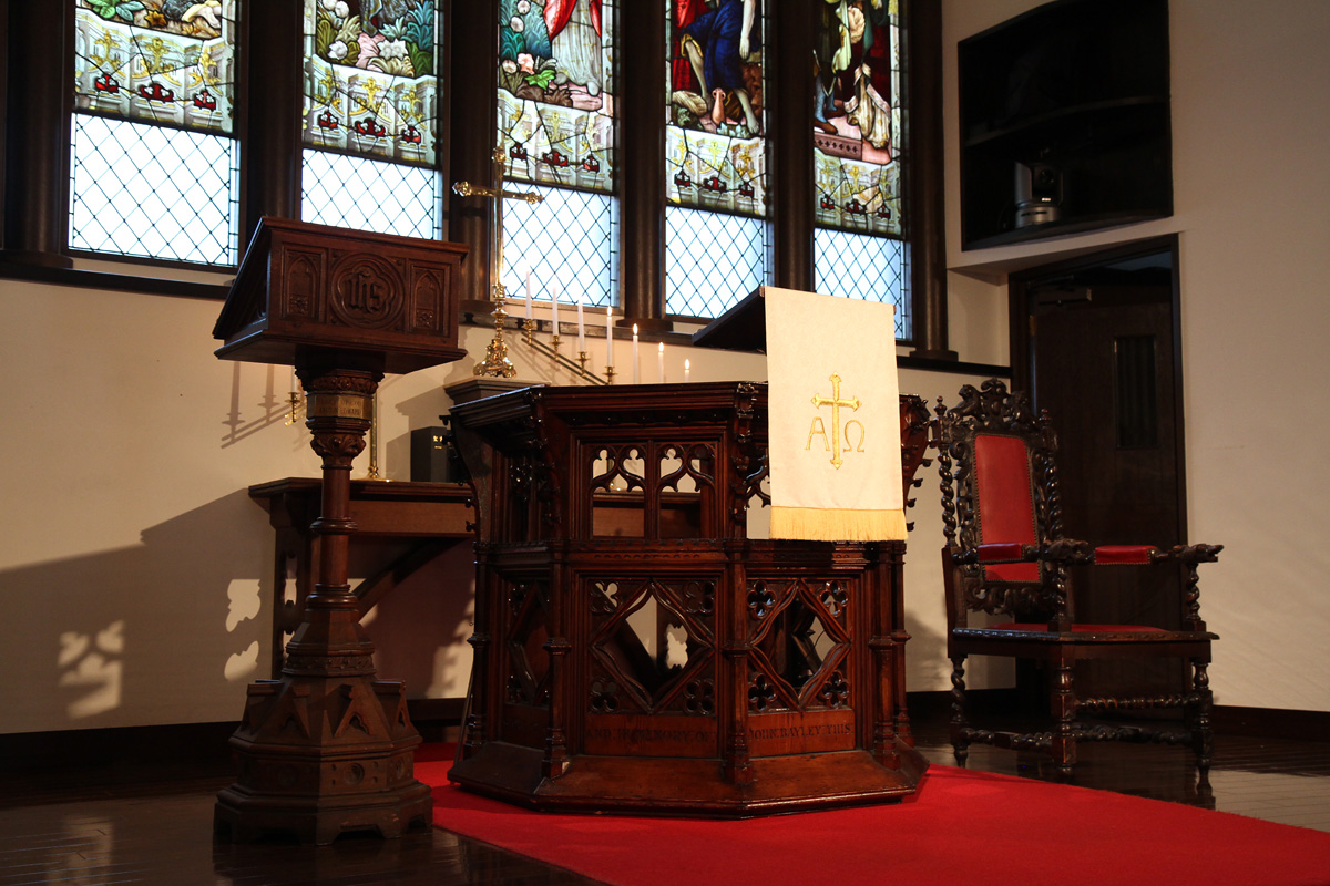 教会のシンボルである十字架を中心に、ひときわ大きな存在感を放っている講壇や聖書台、牧師の椅子など、家具や調度品の多くはかつて英国の教会で実際に使用されていたもの。どれも立派に作られているのはたんに美観のためではなく、偉大な神の権威を象徴しています。信仰者たちの神への熱い愛が伝わってくるようです。