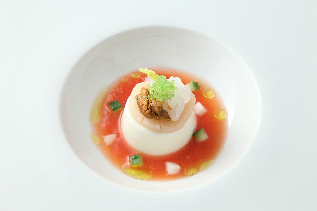 帆立貝の甘み、海の香りをトマトベースの上品なスープで引き立てた冷製の一品。