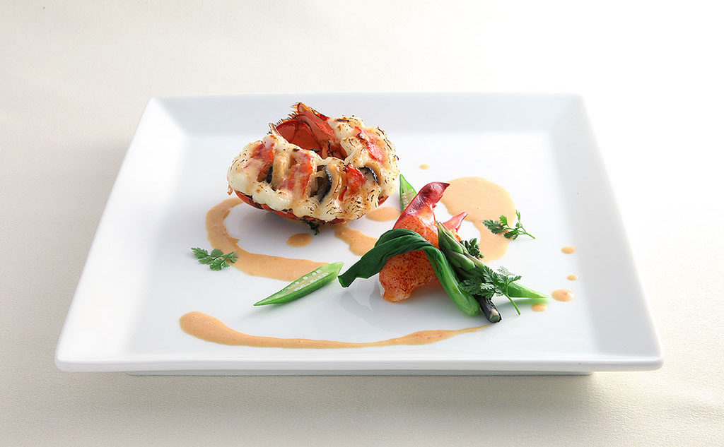 オマール海老・トリュフ・マッシュルームのグラタン仕立て。甲殻類特有の旨味と