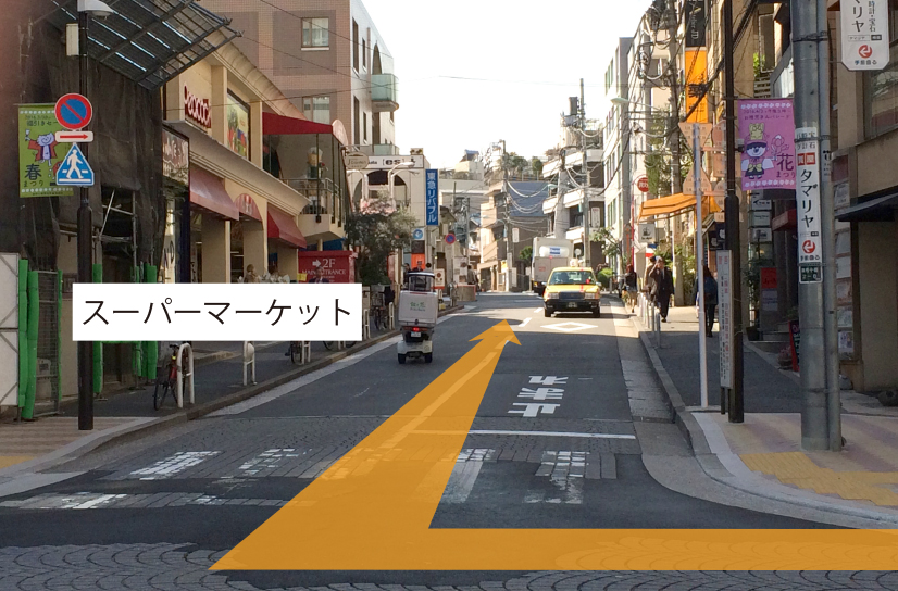 右折すると、左手にスーパーマーケット、右手にマツモトキヨシが見えます。