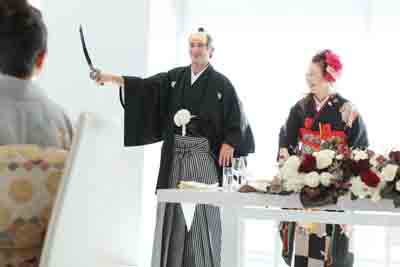 袴を着るなら侍のように刀を持ちたい、という新郎の希望を取り入れたいと模造刀を使ったパフォーマンスを入れたこと。