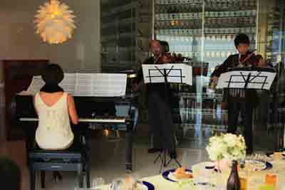 新郎父と新郎のバイオリン演奏。新郎はこれが終わるまで気が休まらなかったようですが、、、。笑