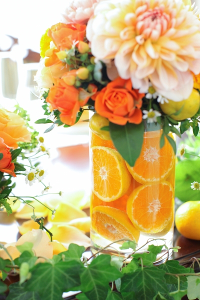 愛媛カラーをテーマにテーブルの上を工夫して頂きました。みかん入りの花瓶や