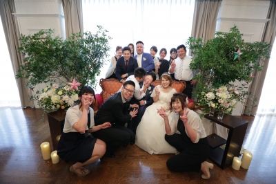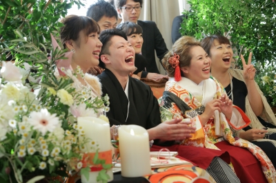 高砂がソファでテーブルがないのが斬新だね!と言われたこと。衣装はテーブルに隠れず全部見せることができたし、友人との写真の距離が近く撮れたりと料理が食べる暇がないほど良いこと尽くしでした。