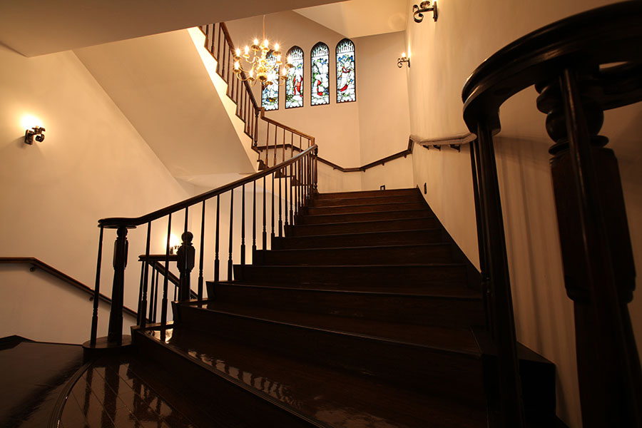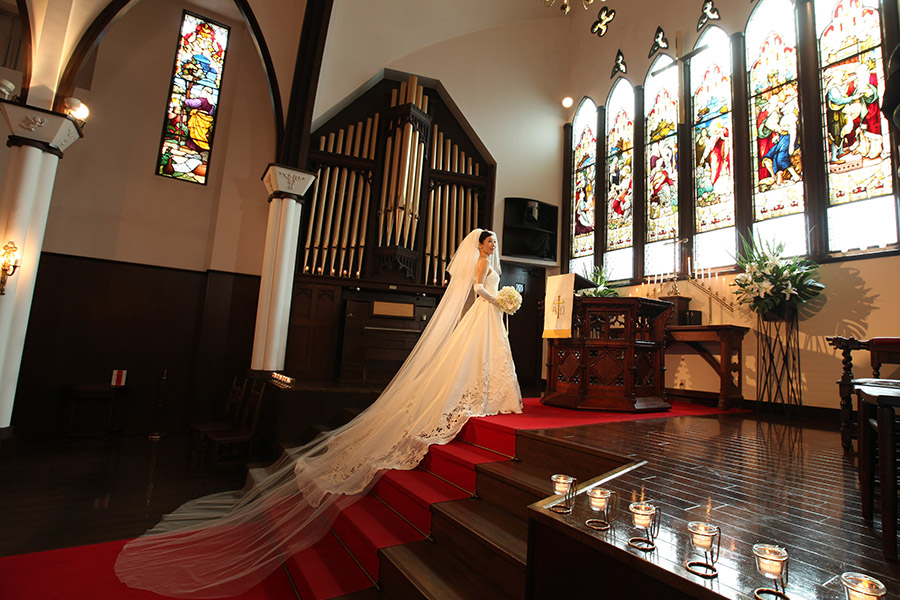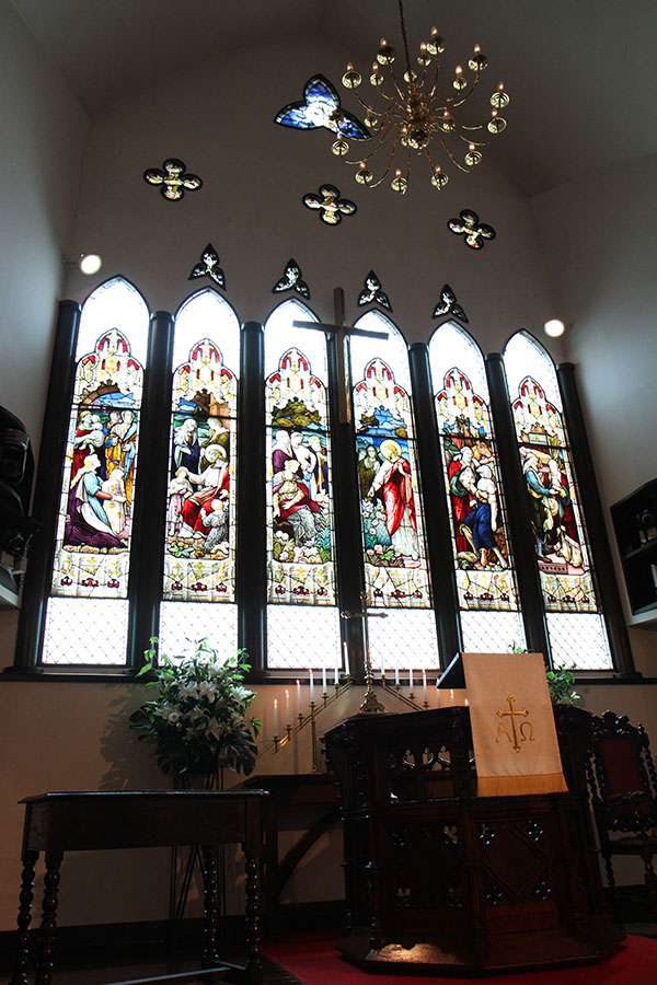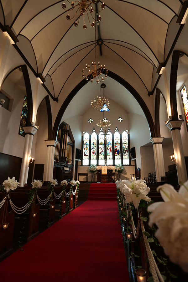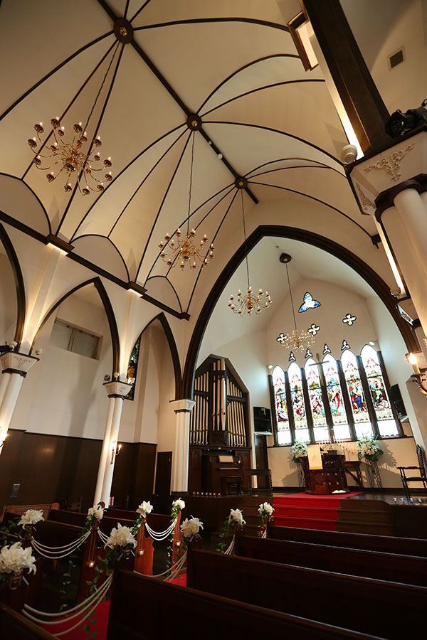 荘厳な内部を飾る美しいステンドグラスをはじめ、講壇、聖書台、ベンチなどの調度品は二百年以上も前に英国の教会で愛用されていた品々を譲り受けたもの。