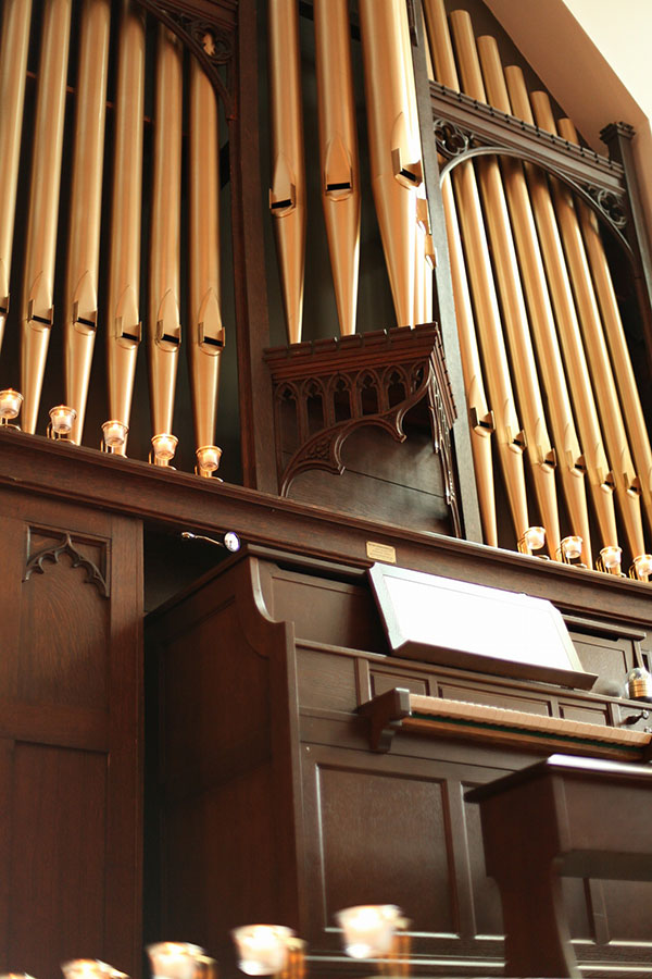 高さ12メートルのコウモリ天井がパイプオルガンと讃美歌の調べを、礼拝堂内に優雅に響き渡らせます。