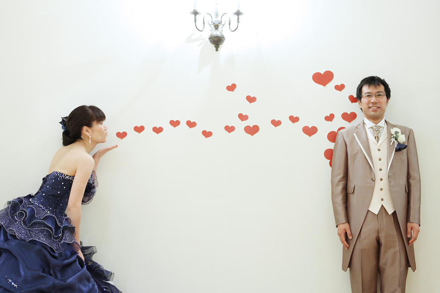 ご新婦様のラブラブビーム!!(白い壁にハートのシールを貼っています♪)